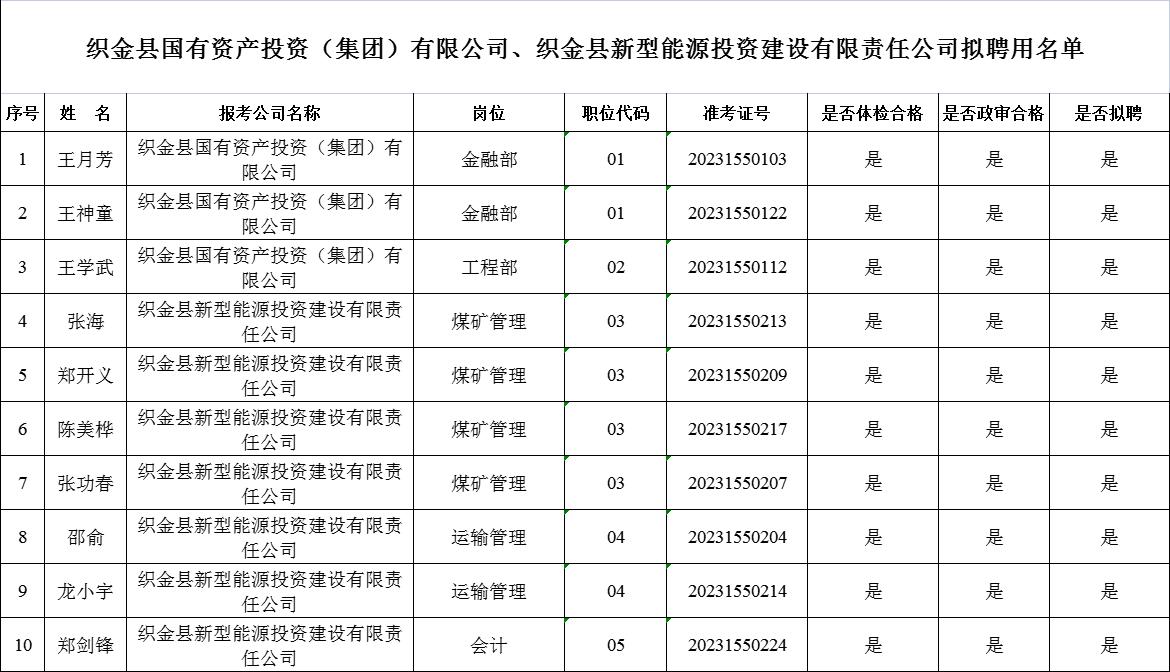 根據(jù)《織金縣國(guó)有資產(chǎn)投資(集團(tuán))有限公司、織金縣新型能源投資建設(shè)有限責(zé)任公司2023年面向社會(huì)公開招聘工作人員公告》,經(jīng)過報(bào)名、筆試、面試、資格審查、體檢、政審等程序,現(xiàn)對(duì)擬聘用人(名單見附件1)予以公示。