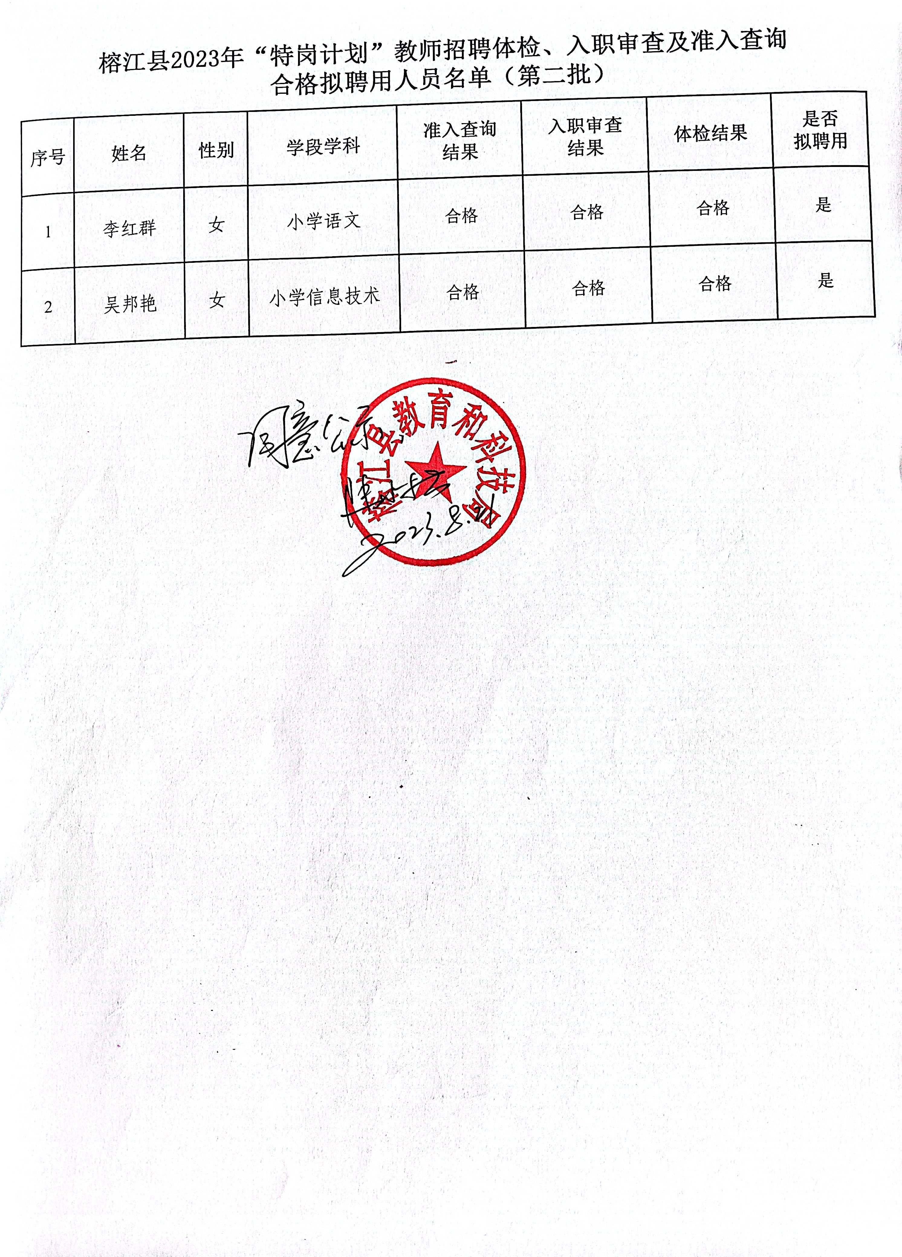 原文標(biāo)題:榕江縣2023年“特崗計劃“教師招聘體檢、入職審查及準(zhǔn)入查詢合格擬聘用人員名單公示(第二批2人)